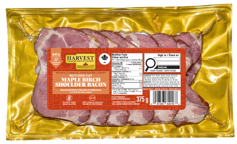 Gluten free, no MSG added, naturally smoked, very high in protein. 44% Less Fat than Harvest Thick Sliced Bacon. Made in Canada.
